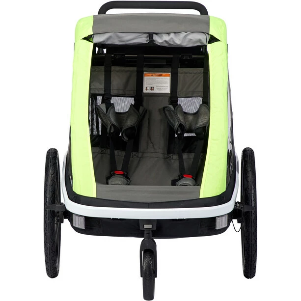 When you need to transport two children, the lightweight yet sturdy Avenida bicycle trailer offers the ultimate in urban protection and ride comfort. And the Avenida is more than just a trailer – the multifunctional children’s trailer easily turns into a double buggy by removing the bicycle drawbar and securely mounting a buggy wheel.