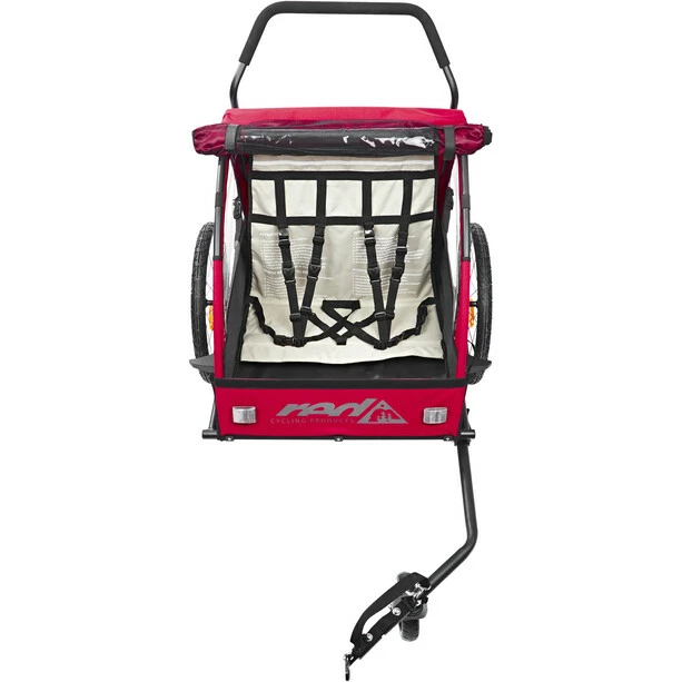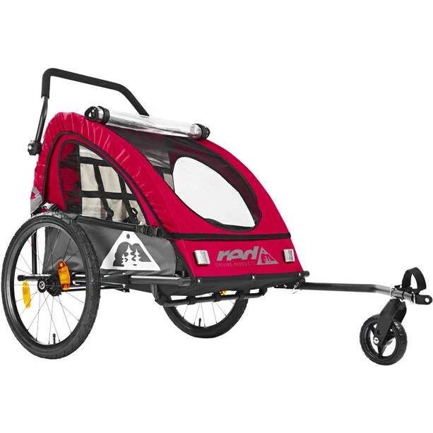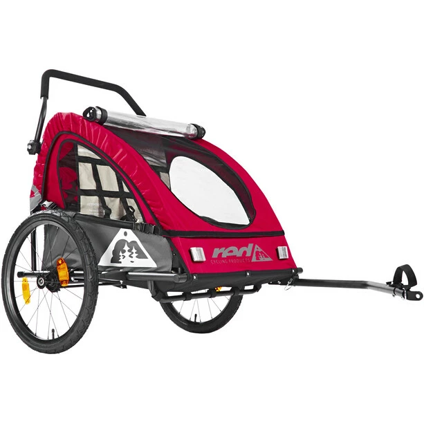 The Red Cycling Products PRO Kids Bike Trailer is an all-rounder. It offers space for 2 children and still some storage space for the favorite cuddly toy. Quickly mounted on the bike and just as quickly and easily converted into a jogger, the Kids Bike Trailer impresses with its versatility and incredible price-performance ratio.