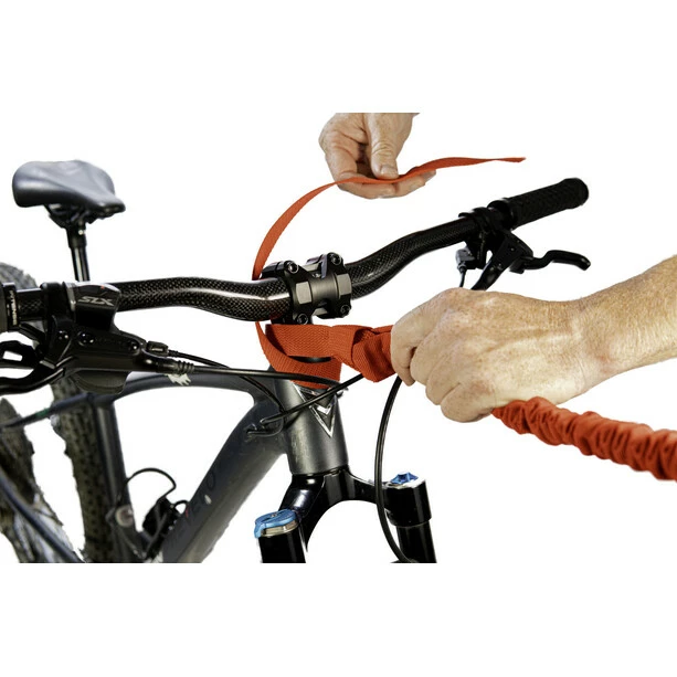 The Quick Release is a friction based instant detachment system accessory for TowWhee Adventure Tow Bungees. Recommended for more advanced riders, going hard or riding more technical terrain. If the 2nd rider gets frightened or out of control, by simply loosening their grip the system will release immediately keeping both riders safe and happy! Loop the Quick Release through the TowWhee loop, then through its own loop. Pull tight as an extension of the TowWhee itself. Loop the Quick Release around the stem or frame once then up to the handle bar. The 2nd rider holds the Release in their grip. We recommend looping the Quick Release entering on the opposite side of the rear brake of the bike, around under the strap then up to the front brake hand.